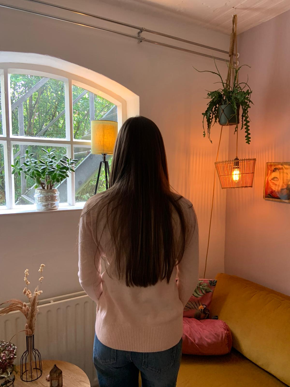 De lichtroze kleur is perfect te combineren met neutrale kleuren zoals beige of lichtgrijs.