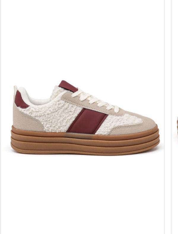 Deze sneaker met plateauzool Teddybont en suède in het beige en burgundy.