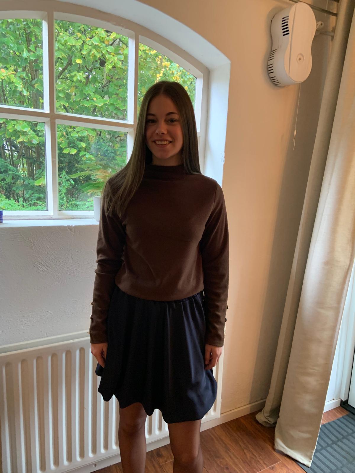 De bruine trui met opstaande kraag en mooie knoopjes op de mouwen